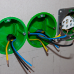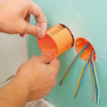 Если места определены правильно, то через отверстие вы получите доступ к окончанию кабеля электропроводки. Следующим шагом, вмонтируйте в отверстие подрозетник. Вырежьте в днище отверстия нужного диаметра, чтобы провести в них провода. Вытянете кабель наружу из-за гипсокартона и вставьте подрозетник в штробу. По сторонам подрозетника вы увидите винты. Их нужно подтягивать, пока лапки не зафиксируют корпус подрозетника в отверстии.