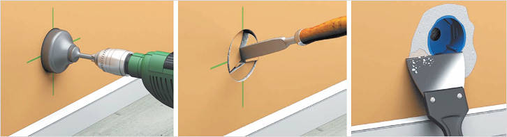 Наиболее распространенная необходимость сверлить круглые дыры в гипсокартоне – это установка розеток. Невидимая часть розетки, пластиковая круглая монтажная коробочка, которая крепится в стене, называется подрозетник. Различают подрозетники для бетона, дерева и гипсокартона.