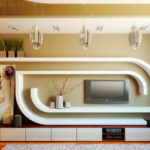 Для данной конструкции мы советуем использовать мокрый метод сгиба: несколько раз пройтись по листу валиком с шипами, после чего намочить влажной губкой, для того, чтобы размочить гипс. Когда лист начнет поддаваться сгибу, то можно соединить его с каркасом. Для полок лучше не использовать гипсокартон, а взять вместо него ДВП или фанеру. Если вы все-таки решили сделать точечное освещение в нише с помощью светильников, то в листах ГКЛ необходимо проделать отверстие точно по диаметру светильника, после чего можно установить сам светильник.