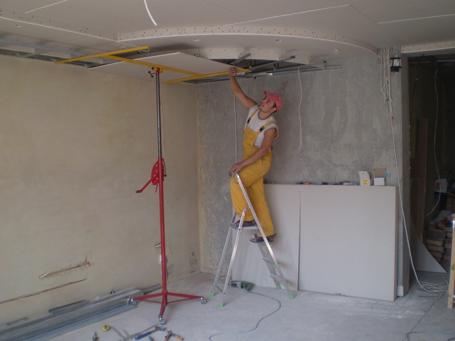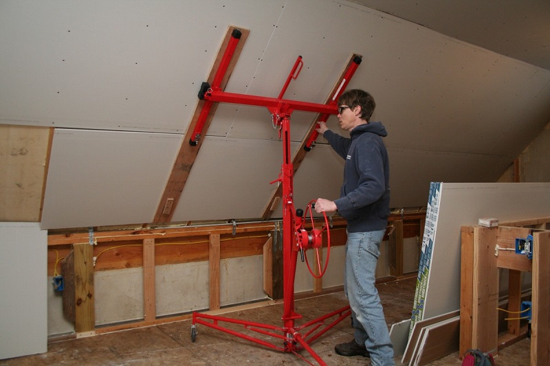 Поэтому в таких ситуациях, целесообразнее всего использовать подъемник для гипсокартона.