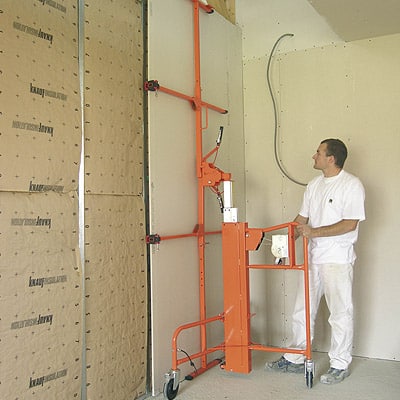 - Корпорации Knauf. Среди раскупаемых, подъемник для гипсокартонных панелей — «Платтенхебер». Устройство позволяет закрепление листов, как в горизонтальном, так и в вертикальном положении;